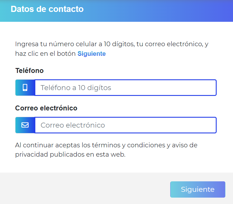 1. Antes de comenzar, debes ingresar a la página web de TopTarjetas MX y dar clic en el botón azul “Quiero la mejor Tarjeta”, se abrirá una nueva ventana con unos datos de contacto que debes diligenciar: Teléfono y correo electrónico. Una vez los rellenes, debes dar clic en continuar.
